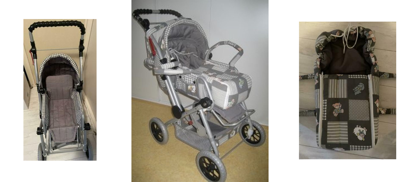 De zak waar de pop in kan liggen kan uit de wagen en heeft 2 handvaten zodat hij los te tillen is. Hier wil je als pop wel in liggen… Verder kun je nog spulletjes meenemen in het mandje onder de wagen.